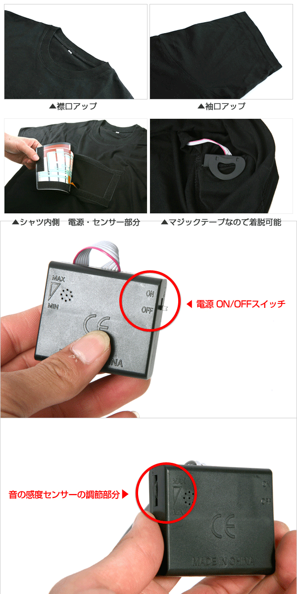 襟口アップ 袖口アップ シャツ内側 電源と音感センサー部分 マジックテープなので 簡単着脱が可能です。