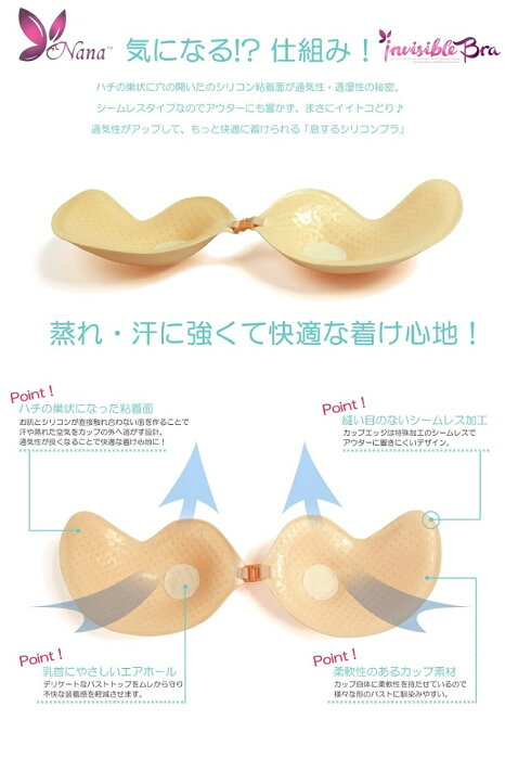商品について 商品名 バタフライヌードブラ 商品説明 ハチの巣状に穴の開いたのシリコン粘着面が通気性・透湿性の秘密シームレスタイプなのでアウターにも響かず、まさにイイトコどり♪